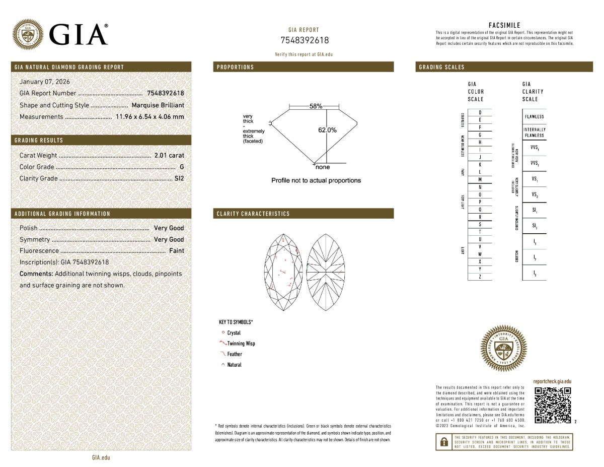 Marquise Shape, 2.01 Carat, G Color, SI2 Clarity