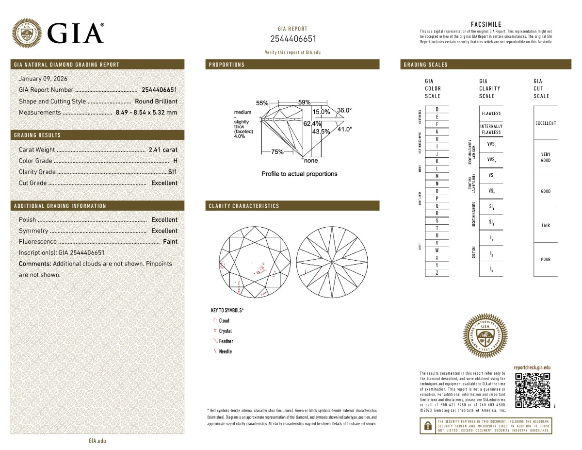 Round Shape, 2.41 Carat, H Color, SI1 Clarity