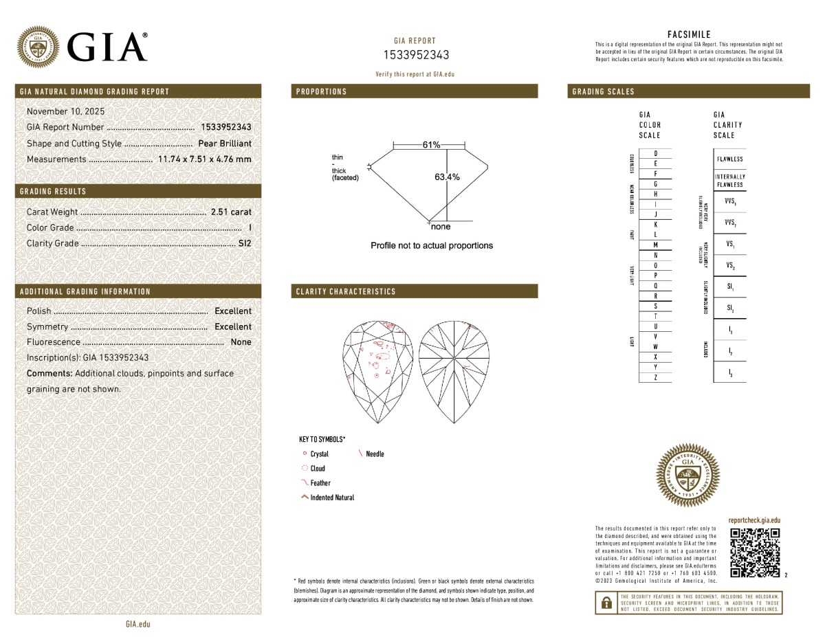 Pear Shape, 2.51 Carat, I Color, SI2 Clarity