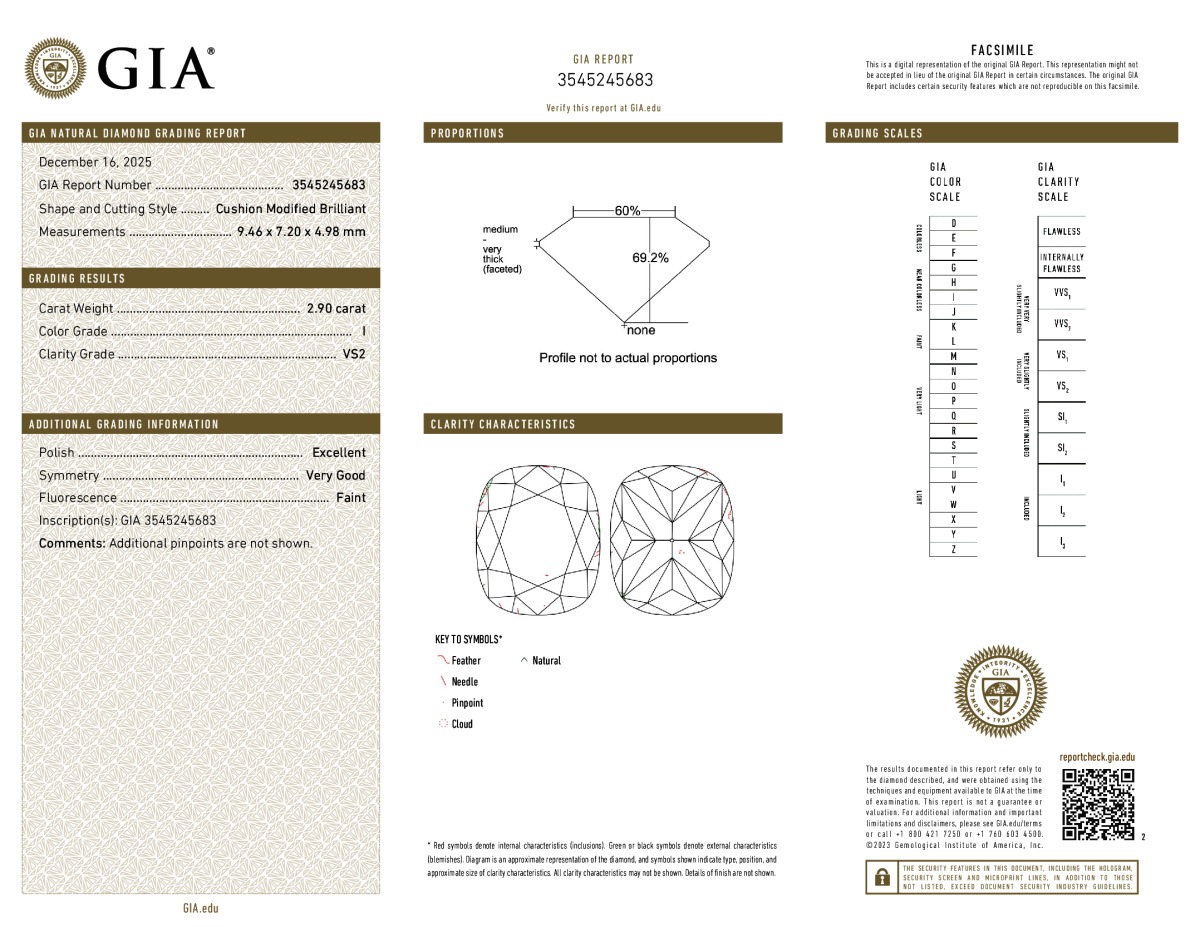 Cushion Shape, 2.90 Carat, I Color, VS2 Clarity