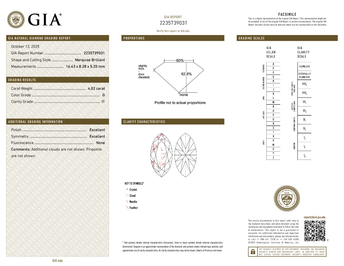 Marquise Shape, 4.02 Carat, G Color, I1 Clarity