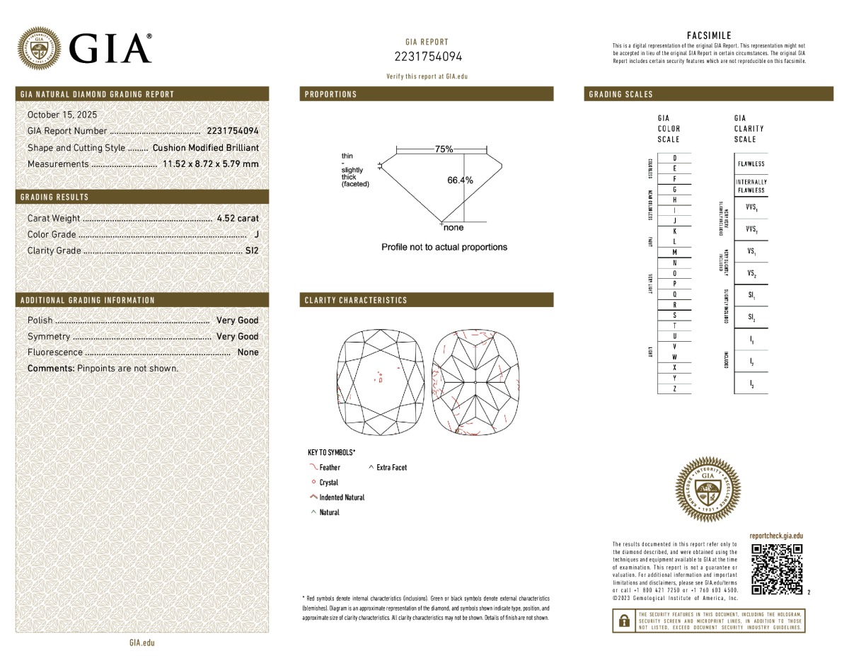 Cushion Shape, 4.52 Carat, J Color, SI2 Clarity