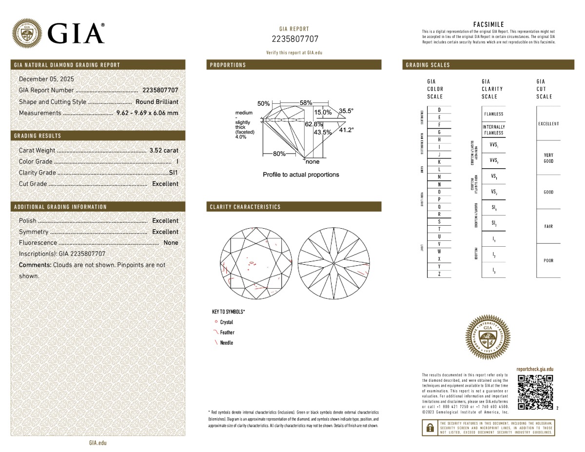 Round Shape, 3.52 Carat, I Color, SI1 Clarity